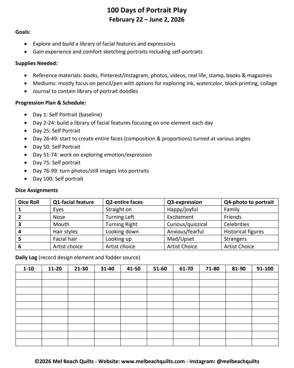 This year, I will be embarking on 100 Days of Portrait Play! This has been an artistic interest of mine for several years and this is my year to explore as I gain experience and comfort sketching stylized portraits. My game plan was developed with great intent to progress from a fairly simple starting point and adding increased difficulty with each quarter to build up a library of facial elements, putting them together, exploring emotion/expression, and then putting it all together to turn photos into portraits. Oh and to help me track my progress, I will be doing 5 self portraits starting with Day 1 and then repeated on Day 25, 50, 75, and 100.