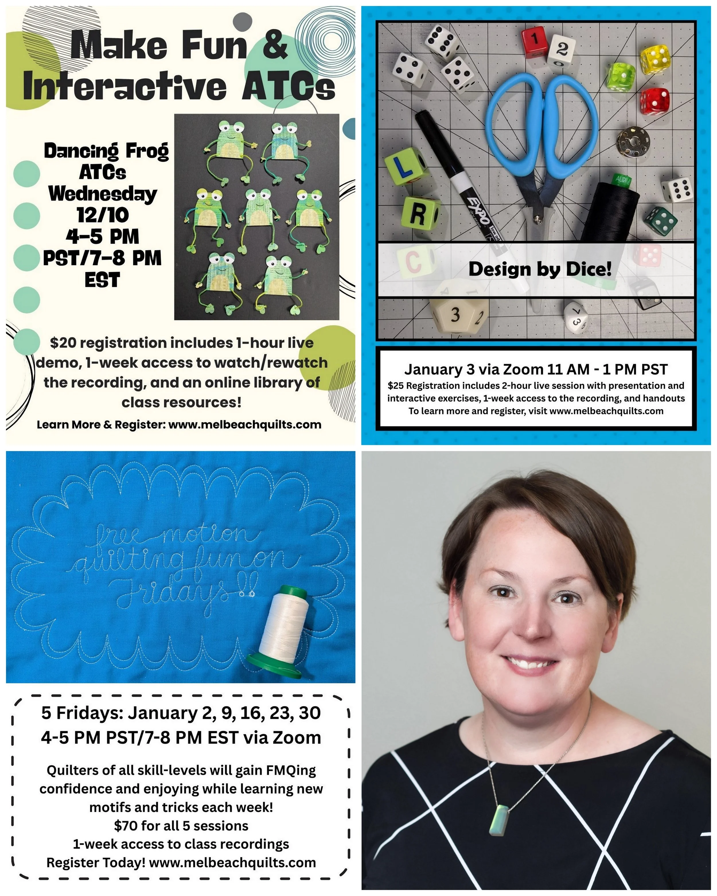 January 2, 9, 16, 23 & 30, 4-5 PM PST: Free Motion Quilting FUN on Fridays! Quilters of all levels will gain confidence while having fun with free-motion quilting fun during this series of five Friday sessions of Free Motion Quilting Fun on Fridays. Each session will focus on a different aspect of free-motion quilting while building upon previous lessons.
